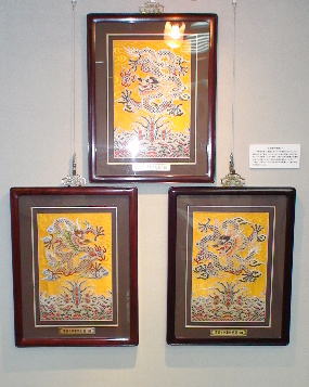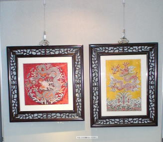 | られた飛龍が舞い、両脇には、高名な書道家の作を元に刺繍された“中華世紀龍”の文字と、雲錦工芸の紹介文の |